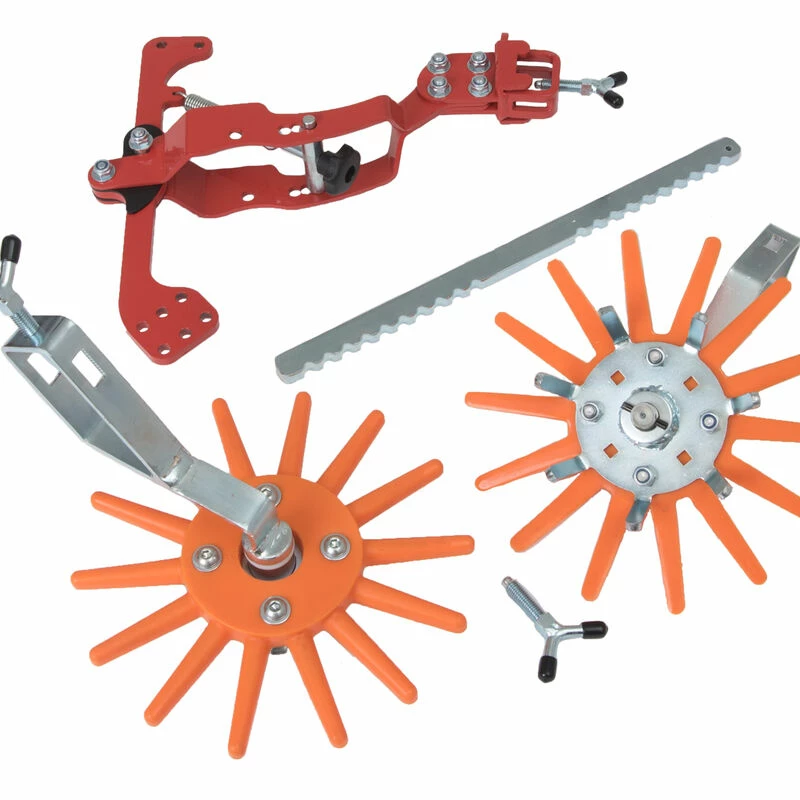 Each assembly has steel traction fingers and 9.5″ polyurethane finger discs on a support shank. Angled in, Finger Weeders turn together, gently agitating the soil near the crop and uprooting thread-stage weeds. For use on many established crops, including brassicas, lettuce, and especially carrots. For greatest efficiency, use in conjunction with other attachments, such as Preci-Discs, for concurrent in-row and inter-row weeding. Includes spring-loaded mounting arm, 16″ toolbar, two Y-bolts, and two finger weeders with upright brackets. Pliable fingers. For soft or sandy soil. Orange. Made in France by Terrateck. NOTE: For use with the Terrateck Double Wheel Hoe only. Also available in a model designed for standard (medium) soil.