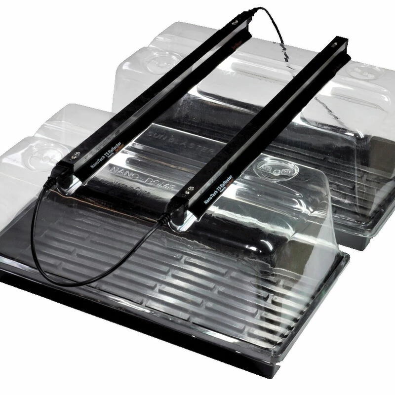 Tall humidity dome features adjustable vents and recessed H-shaped groove on top for added strength. This groove also provides a space to rest and center SunBlaster LED and T5HO strip lights, eliminating the need for hangers. Lights not included. Fits any standard 1020 tray. Height: 7″. Quantity: 5 domes.