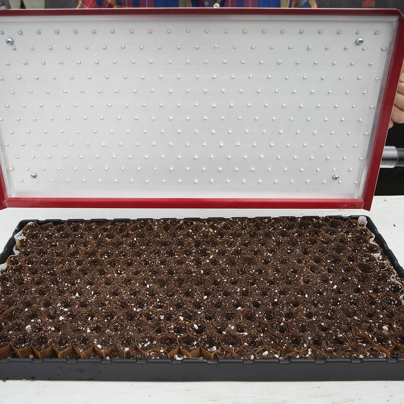 For use with the Precision Vacuum Seeder for Paperpot Trays only. 264 large countersunk holes. Made of precision-machined aluminum. Made in the USA. Crop recommendations from our trials: