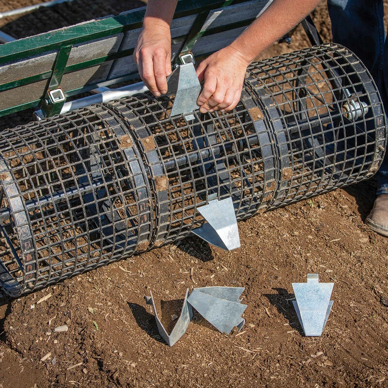 Available in three sizes and easily interchangeable, allowing many combinations of plant spacings. Makes up to 2″ transplanting holes. The seedbed roller’s 1″ mesh and 36″ circumference make dibble arrangement simple and intuitive. No special tools required; just squeeze, and they snap right in, securely gripping the coated trap wire mesh from both inside and out. Change-out for new setups is fast and easy. They work as well through plastic mulch as they do in open soil (sometimes better due to moisture level). Made from galvanized plate steel for corrosion resistance (some edge rust is normal). Made in USA. NOTES: 1.) Always pull roller when using dibbles. 2.) Additional weight is needed to achieve correct dibble spacing and to penetrate plastic mulch.
